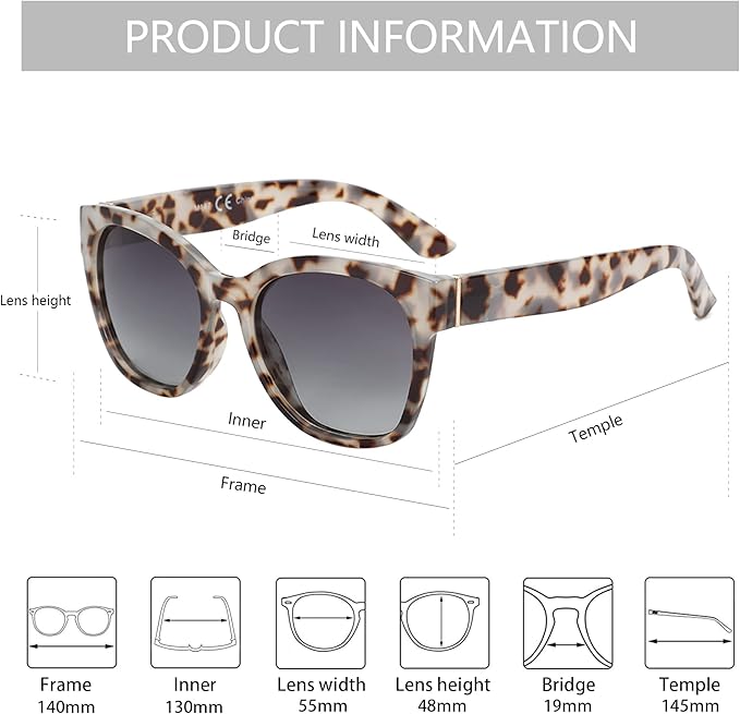 Product Dimension: Lens Width: 55mm (2.16 inches) | Lens Height: 48mm (1.89 inches) | Temple Length: 145mm (5.70 inches) | Nose Bridge: 19mm (0.75 inches) | Frame Length: 140mm (5.51 inches).