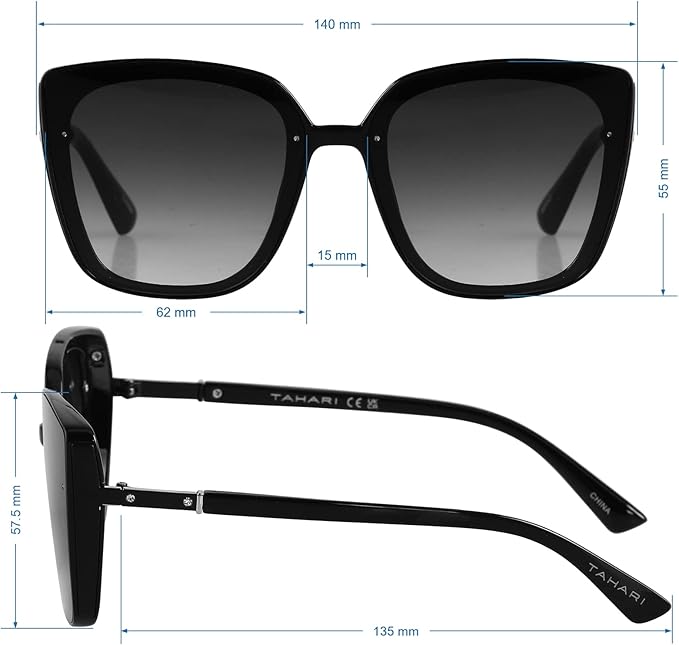 PRODUCT MEASUREMENTS (in millimeters): Lens Width 62 mm, Lens Height 55 mm, Frame Width 140 mm, Frame Height 57.5 mm, Arm Length 135 mm, Bridge Width 15 mm.