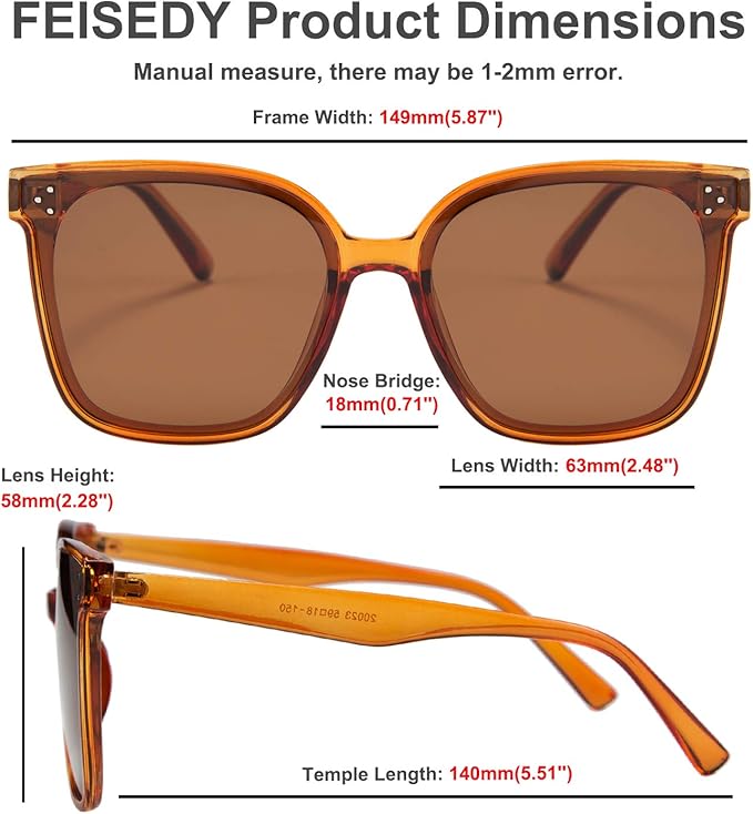 Product Dimensions -- Lens Width: 63mm(2.48''), Lens Height: 58mm(2.28''), Temple Length: 140mm(5.51''), Nose Bridge: 18mm(0.71''), Frame Total Width: 149mm(5.87''). Attention: Manual measure, there may be 1-2mm error. Get stylish outdoor sunglasses to protect your eyes and face.