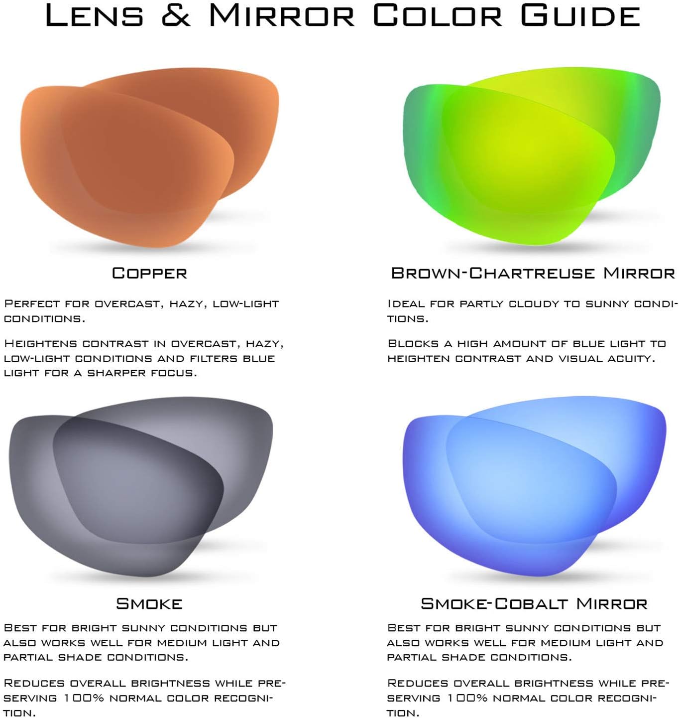 BASE LENS COLOR and UV PROTECTION – Smoke lenses are ideal for bright sunlight with the realistic color reproduction and also work well in medium light and partial shade. Brown lenses increase contrast and depth perception, ideal for partly cloudy to sunny conditions. Copper lenses provide excellent contrast and depth perception, suited for moderate to low light. sunglasses block the harmful UVA and UVB rays and meet U.S. ANSI standards.