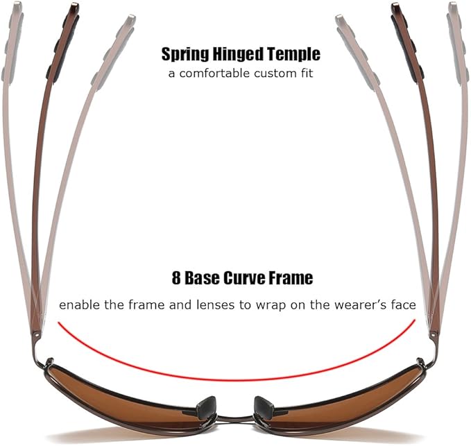 【Spring Hinged Metal Frame】---- wrap sunglasses is made of durable stainless steel metal frame and Al-Mg alloy arms; Spring hinged temple for a comfortable custom fit.