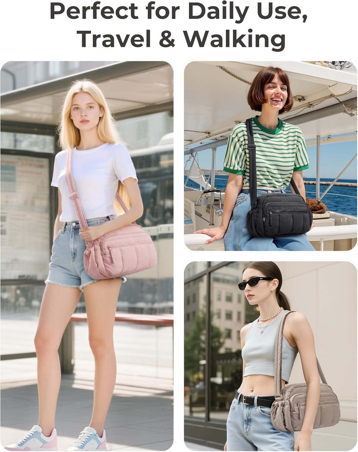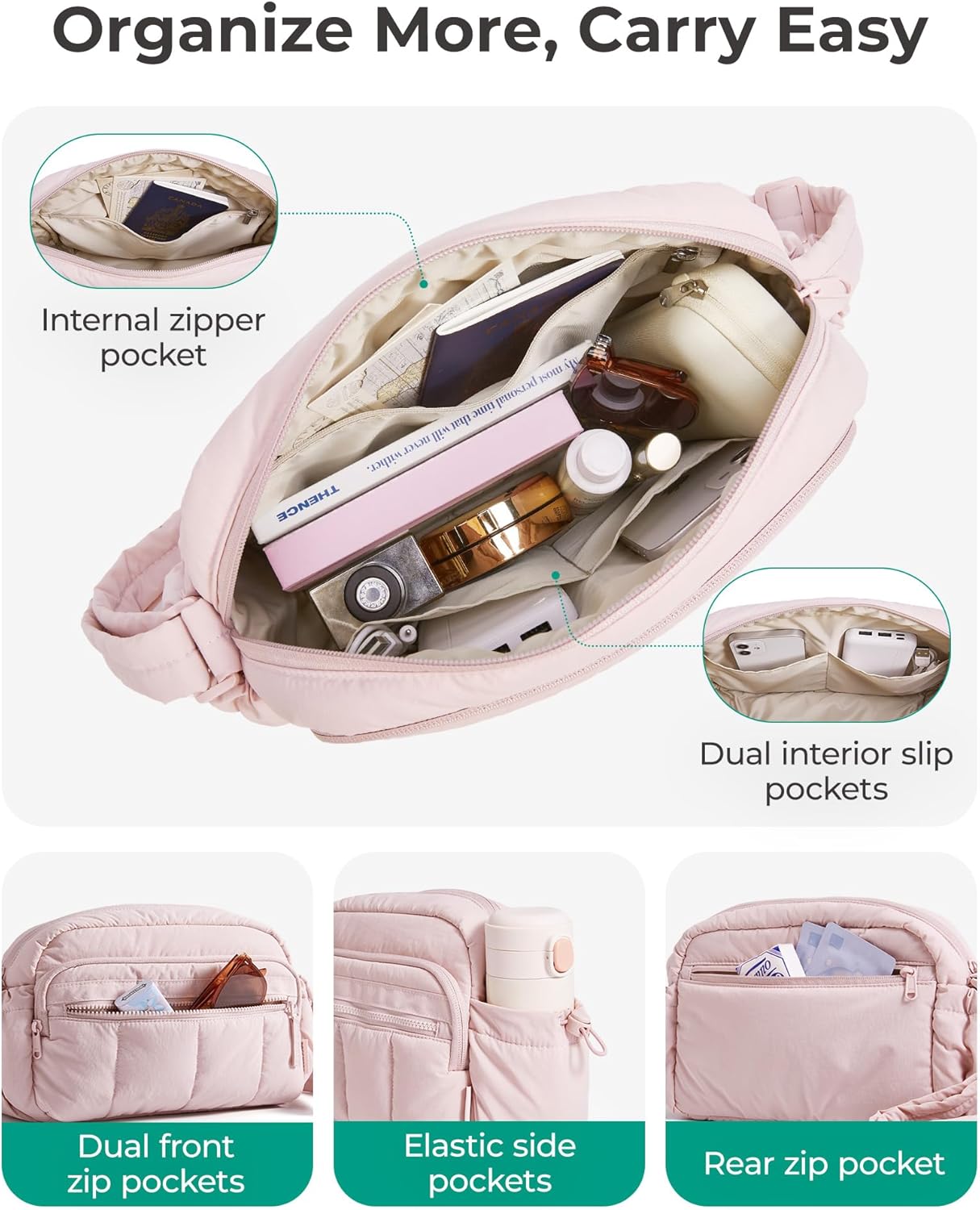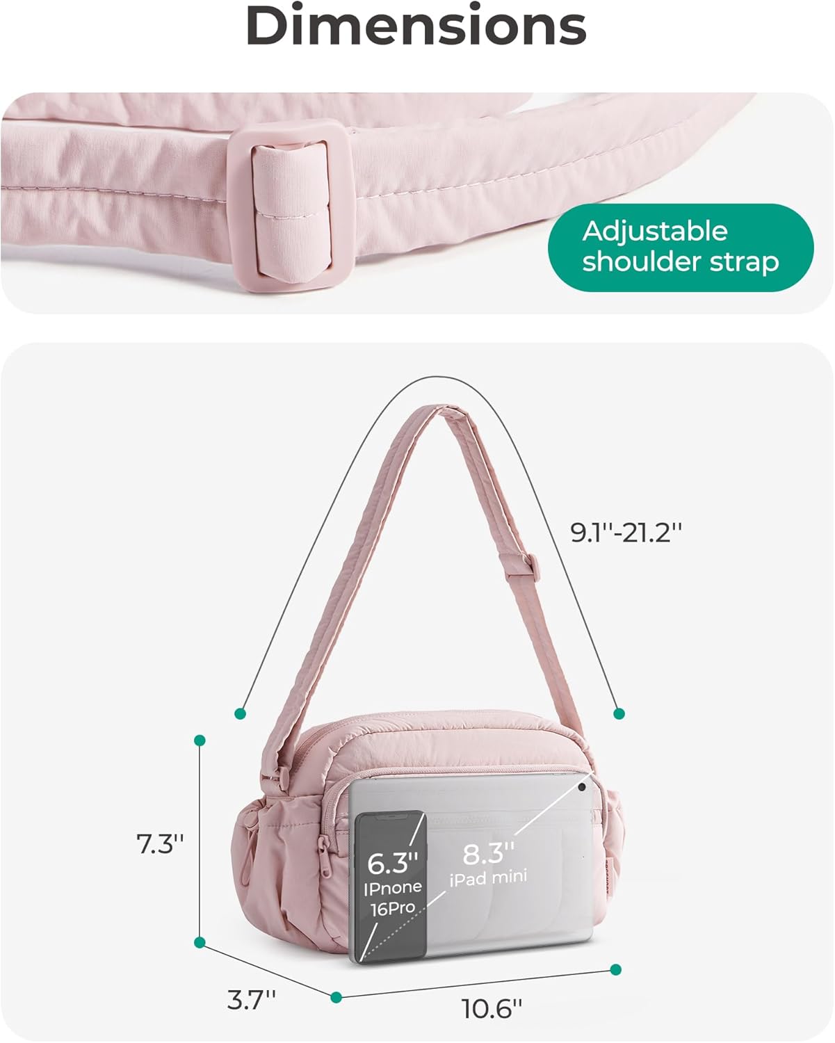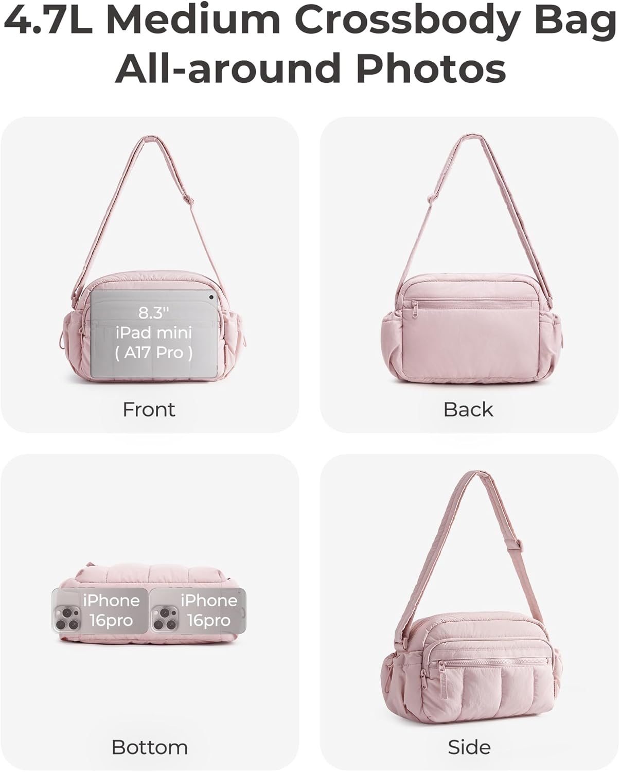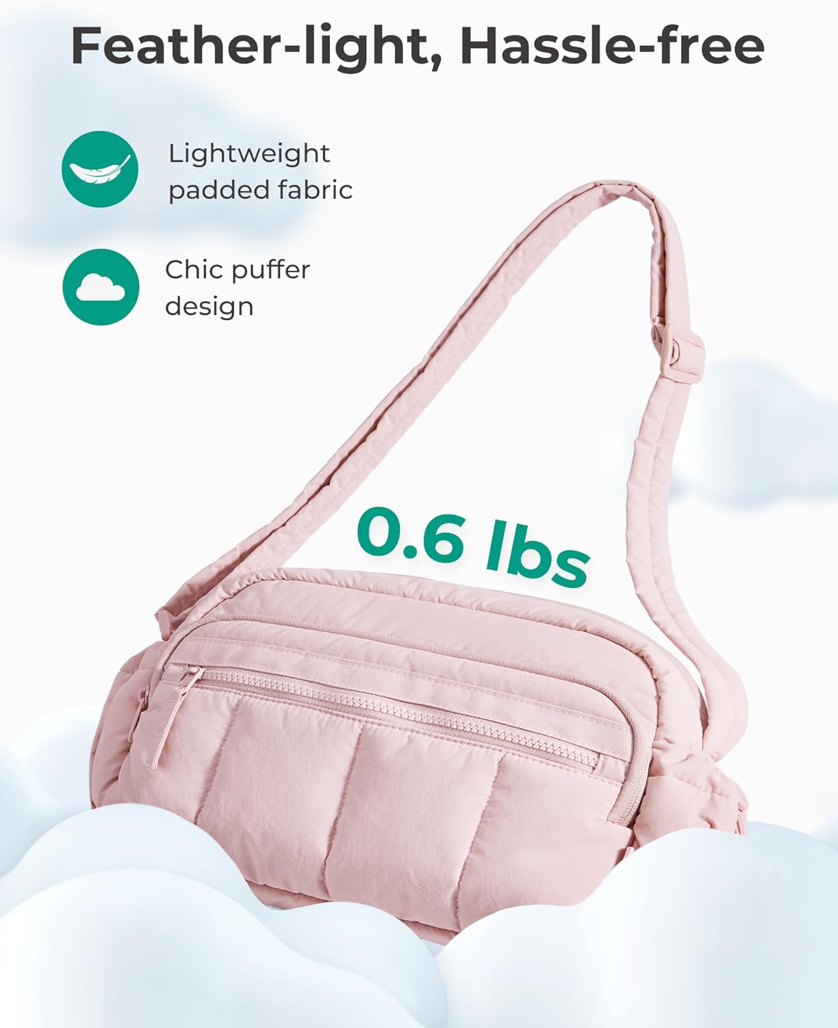 Material & Size: Lightweight & water-resistant puffy crossbody bag (just 0.33lbs)! Compact size 8.7''x2.8''x6.1'' with 2.4L capacity - perfect daily essentials