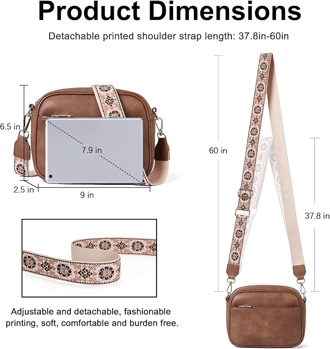 Adjustable Guitar Strap: The length of the travel purses strap can be adjusted to 37.8-60in, and the width of the fall bag‘s strap is 1.5in. Can provide maximum comfort. Bag body 9 * 6.5 * 2.5in. It can be worn as a shoulder bag or crossbody bag, making it very convenient and hands-free.