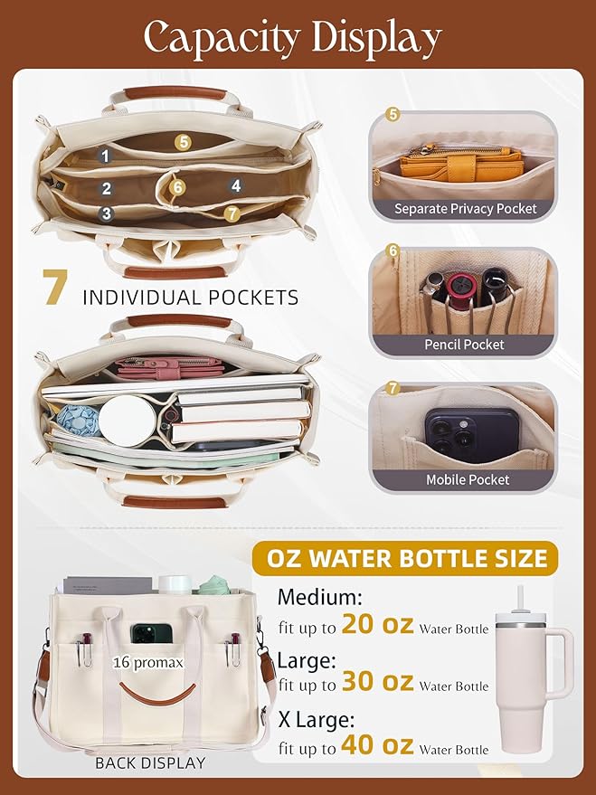 2 sizes available: This tote bag for women of M Size is 13"L×6"W×9.8"H and can hold 13" laptop & 24 oz mug, suitable for work and college; L Size is 15"L×7.3"W×10.8"H, which can hold 15.6" laptop, 40 oz mug and other items for your shop or travel