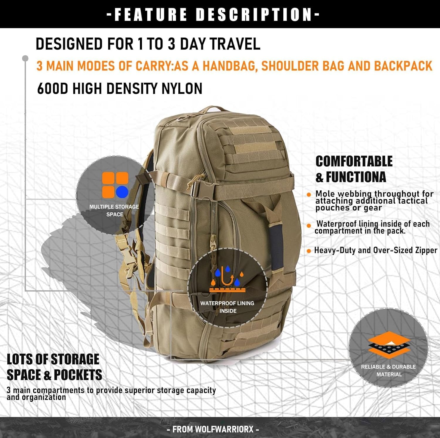【Multifunctional Tactical Travel Bag】3 in 1 gym bag can be used as a Handbag, Shoulder Bag and Backpack.Multiple pockets, pouches, and compartments offer plenty of space and organization, Inside there is an option to use collapsible dividers which make it easy to organize stuff when packing.