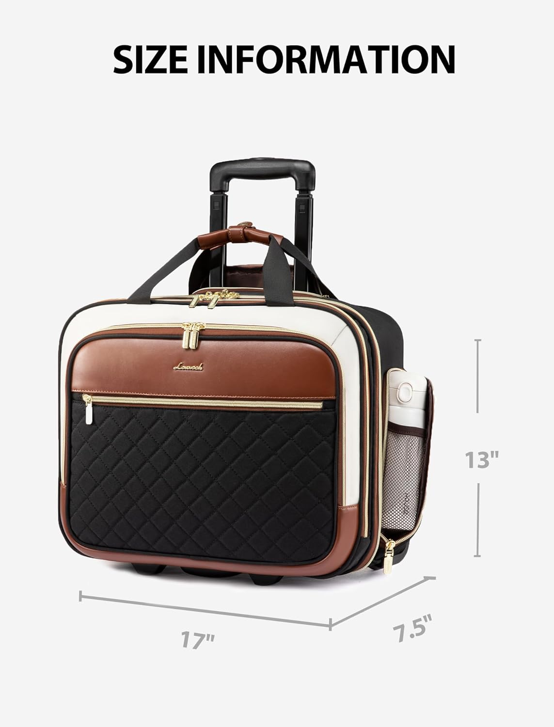 Rolling Laptop Bag Women, 17.3 Inch Laptop Briefcase with Wheels, Soft Sided Underseat Carry On Luggage Personal Item Suitcase for Work Travel Business, Black Brown Beige